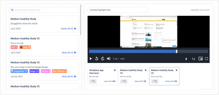 Tagging the transcript, notes and clips is a great way to find themes in your qualitative research across projects and over time. Using tags & reactions will help you identify and keep track of patterns that emerge across your research data.