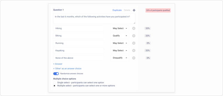 Qualify participants with single and multi select screener surveys. Reduce bias by randomizing the answer choices for multiple/single select test questions and screener questions. Once your study is live, we'll surface where participants are disqualifying on your screener questions so you can make edits on the fly.